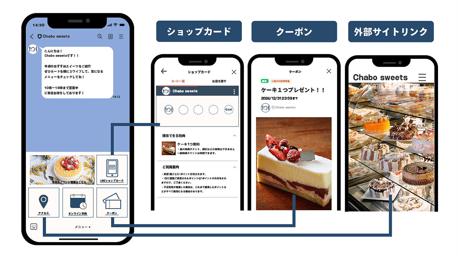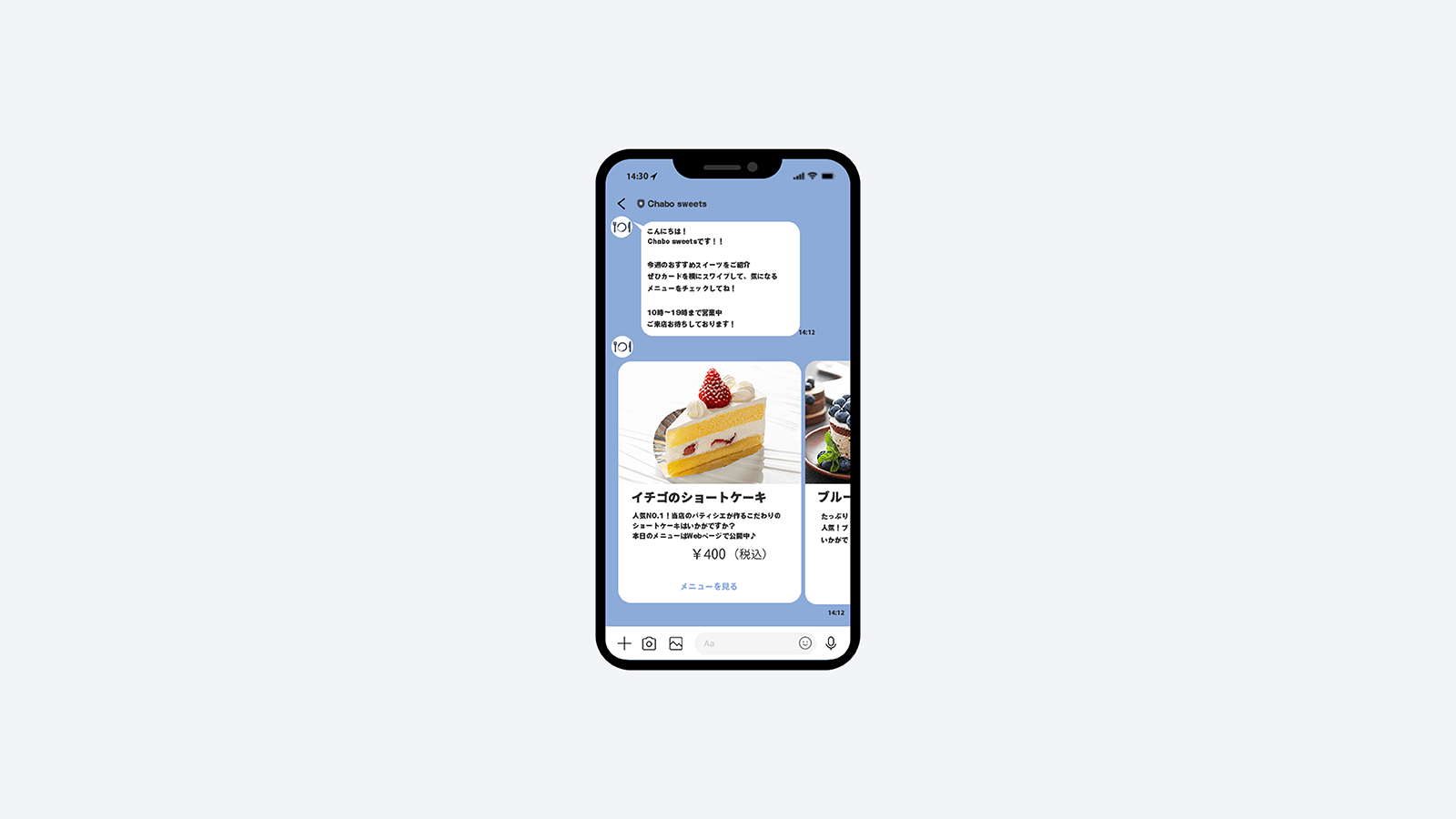 トーク画面の下部に表示されるタイル状のメニューで、クーポンやショップカードなど目立たせたい内容を設定できる、大きな誘導効果を期待できる機能です。メニューは、オンラインストアへのリンクや、問い合わせフォームへのショートカットなど、カスタマイズ可能です。