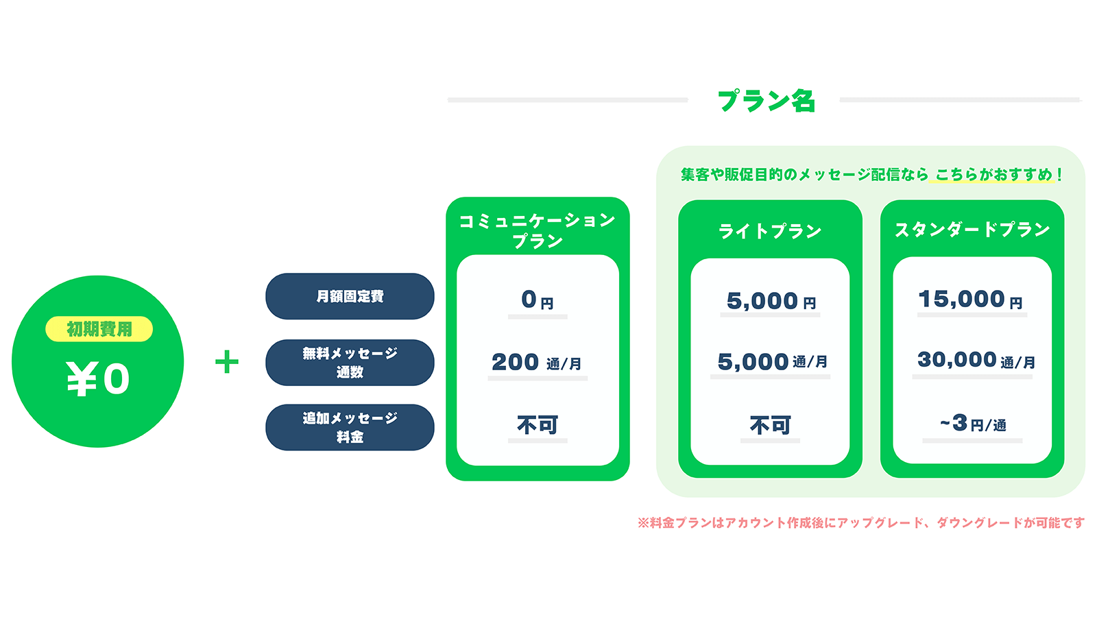 - 月額無料コミュニケーションプランでは、LINE公式アカウントの基本的な機能が利用可能です。月額固定費は一切かからず、月間最大200通までメッセージを送信できます。200通を超えるメッセージの配信はできません。