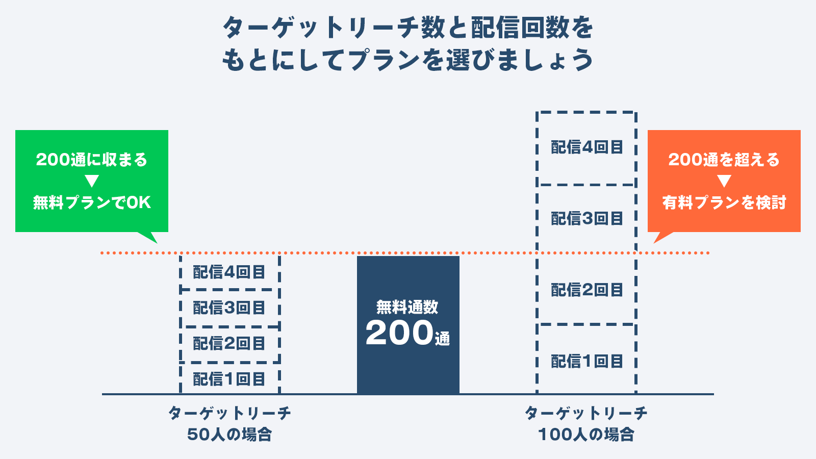 このように定期的にメッセージを配信する際は、「ターゲットリーチの数」と「月ごとの配信回数」を基準に料金プランを決めることがおすすめです。
