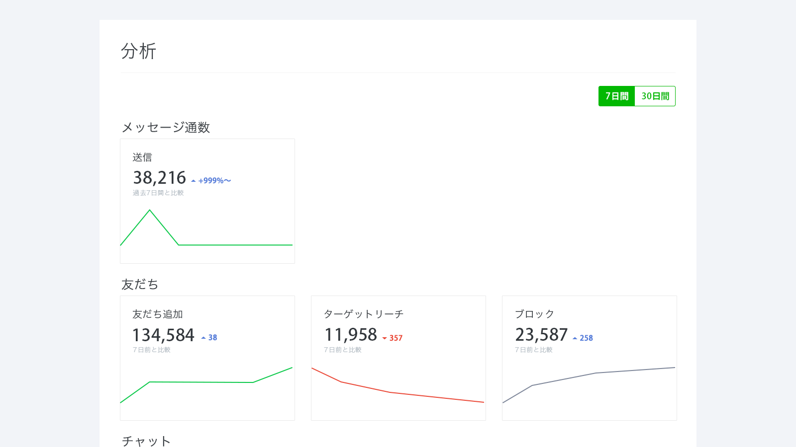 - アカウントのパフォーマンスを確認できる管理ダッシュボードがあります。これには、友だち数の推移やメッセージ通数、ターゲットリーチやブロック数などが表示されています。